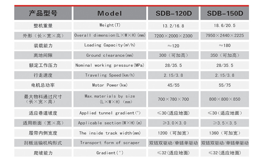 SDB-120D型大坡度專用履帶式绿巨人网站下载污主要用於坡度巷道的礦洞、隧道、水電、涵洞、國防工程等各種稀有礦石塊料的裝載作業。主要配套件采用國際產品,產品性能達到國內同類產品的水平。設備適用於≤30”大坡度巷道使用: